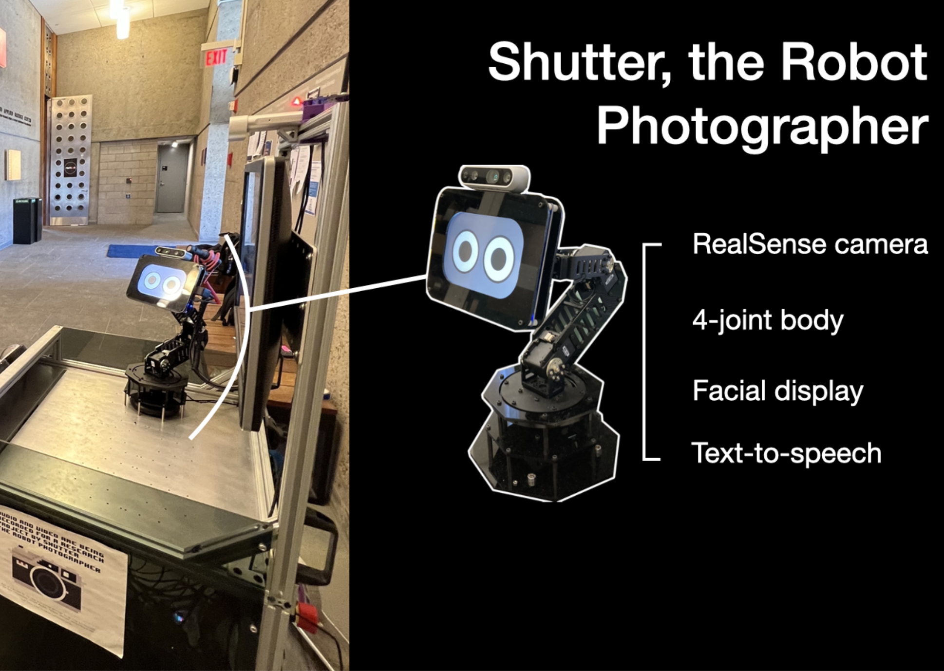 Shutter is an interactive robot photographer that allows users to direct photo framing using intuitive hand gestures. By leveraging a Kinect Azure sensor for real-time skeletal tracking, users can control a robot-mounted camera's pan, tilt, and zoom through simple hand movements (pointing left, right, up, and down). The system maps hand positions to camera adjustments, enabling users to compose shots naturally. Once the desired framing is achieved, users can trigger the shutter with a thumbs up gesture. This project enhances human-robot interaction, giving users creative control over robotic photography through natural motion.
